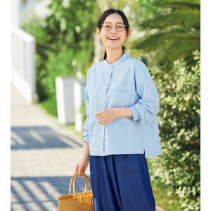 麻調バンドカラー ダブルポケットブラウス