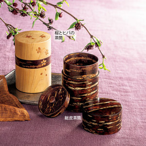 ●材質/総皮茶筒=さわぐるみ材、総さくら皮張り、桜とヒバの茶筒=さわぐるみ材、ヒバ材、さくら皮・・・