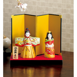 ●材質/雛=陶磁器、台=圧縮合板、屏風=紙、毛せん=ポリエステル、札=木、ひも=レーヨン