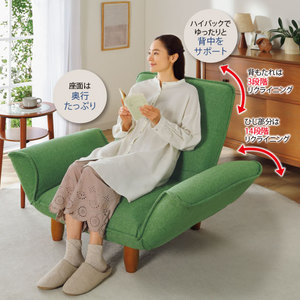 ひじ掛けを枕に、寝転んでも。背もたれの角度に合わせてひじ掛けの高さも連動!