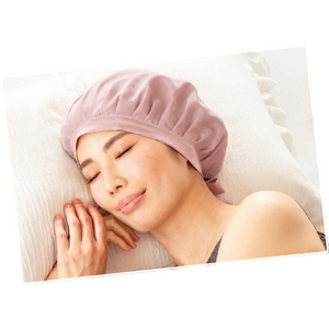 就寝中、摩擦や乾燥から髪を守るシルクキャップ。