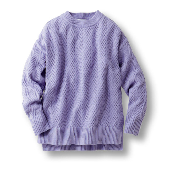 パッと目を惹くきれい色で、顔映りが明るいニット。ほどよいゆる感とヘリンボーン柄の凹凸効果で体形カバーも叶います。乾燥機が使えて毛玉になりにくく、お手入れ簡単。