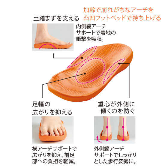内側縦アーチサポートで着地の衝撃を吸収。横アーチサポートで広がりを抑え、前足部への負担を軽減。外側縦アーチサポートでしっかりとした歩行姿勢に。