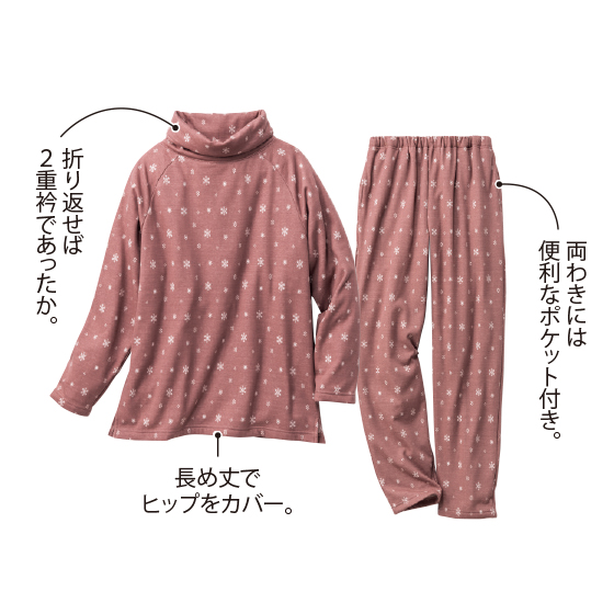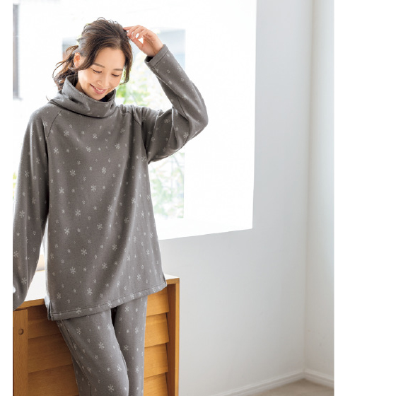 たっぷりした毛足の裏起毛パジャマ。スタンド衿で寝ている間も首回りがぬくぬく。伸縮性があって動きやすいのも◎。