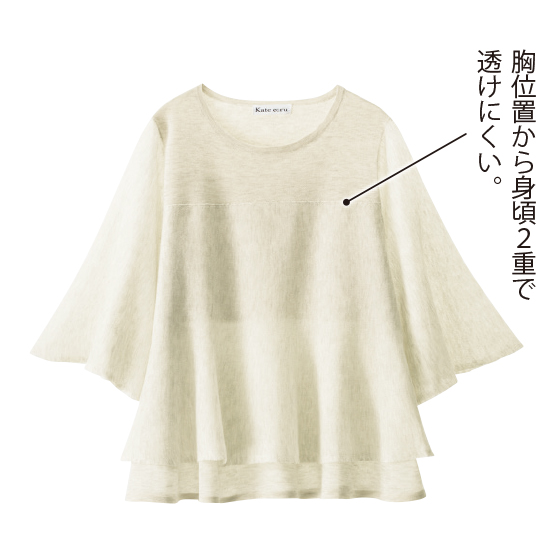 ふわっと開くベル袖と、ティアード風に重ねたフレア裾。薄手でドライな編み地で、透け感も涼しげなニットです。内側の裾をボトムにインして、丈や甘さがアレンジできます。