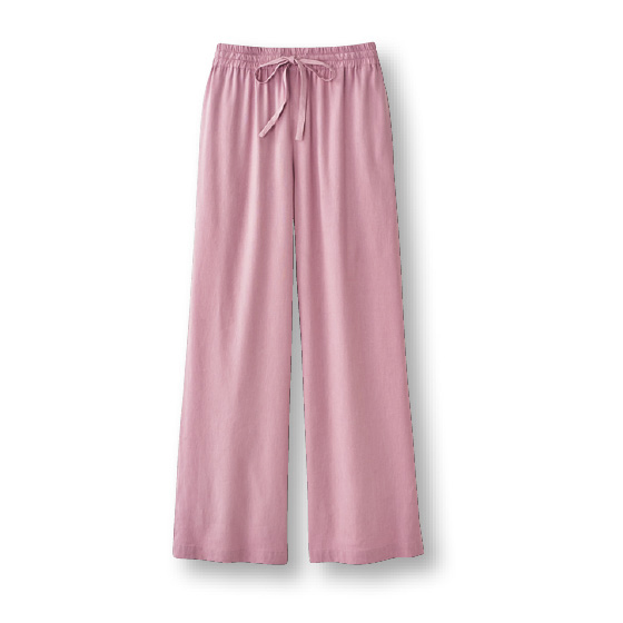 ストレッチリネンにレーヨンなどを混紡した素材は、麻特有の風が抜ける、肌にまとわりつきにくいドライなタッチ。ストレートワイドなきれいな落ち感が“おしゃれ見え”するイージーパンツです。※春夏秋におすすめです。
