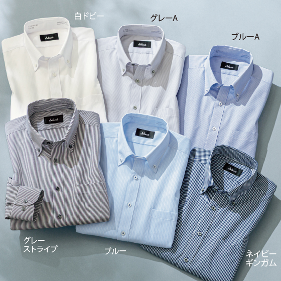 ●素材:ポリエステル65%・綿35%(織物、ネイビーギンガム・グレーストライプ・ブルーA・グレーA=平織、白ドビー・ブルー=ドビー、速乾素材、形態安定加工)
