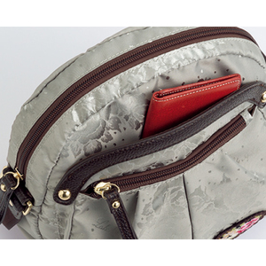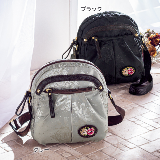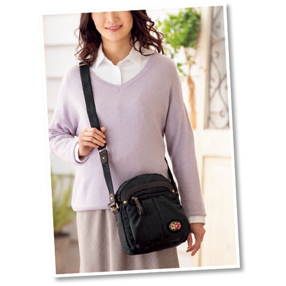 ローズ柄のジャカード生地に、ブランドの代名詞、シェニール織のワッペンがおしゃれ。軽くて手があけられるうえ、ポケット充実で持ち物を整理しやすく、旅行にもぴったりです。大小のポケットやホルダーで収納力も充実。ななめ掛けすれば、両手があいてラク!