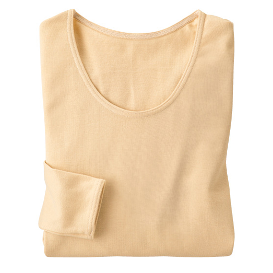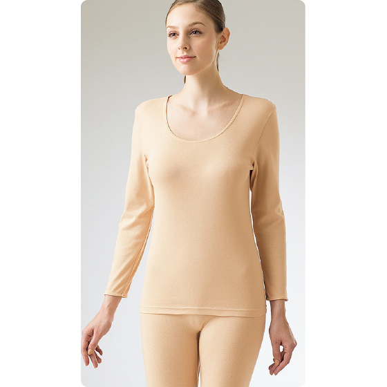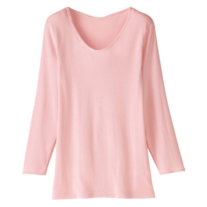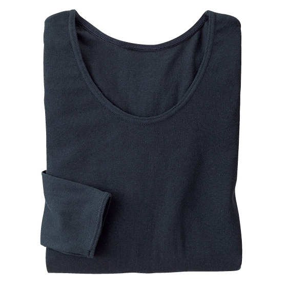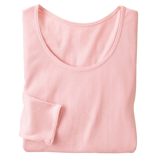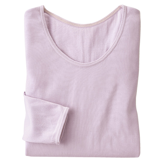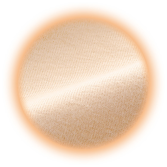 綿100%素材に、体の湿気を吸って熱に換える吸湿発熱加工を施しました。暖かな着心地を保ちます。わき縫いなしで、ゴロつきにくい。