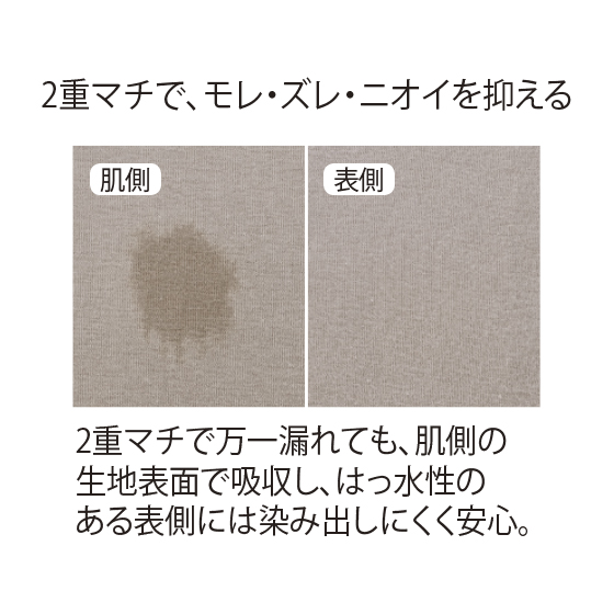 まるで普通のショーツみたい!2重マチで万一漏れても、肌側の生地表面で吸収し、はっ水性のある表側には染み出しにくく安心。伸縮性のある2重マチで、吸水ナプキンがフィットしてズレにくい。マチ裏は綿混素材です。