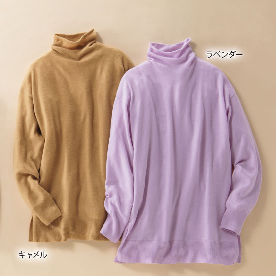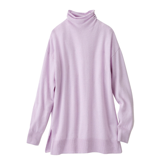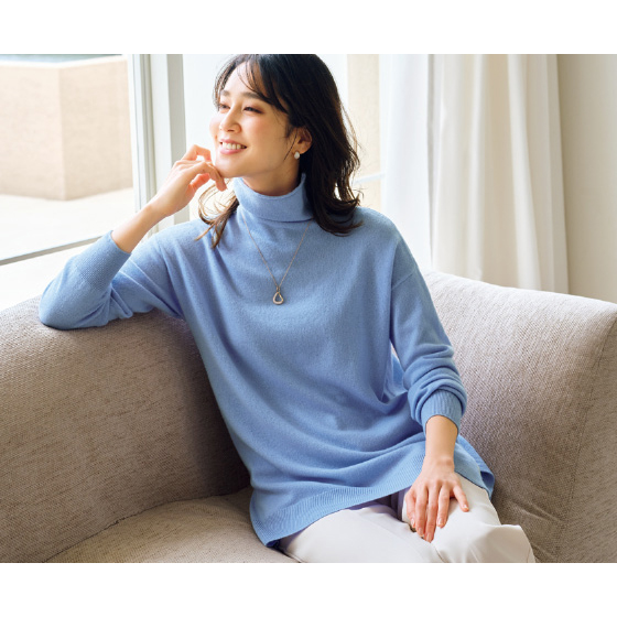 カシミヤ山羊のやわらかな原毛を使ったぜいたくな風合い。とろけるような肌触りと、やわらかく軽やかな着心地も魅力です。編み地の表面は繊細で美しい光沢感があり、大人にふさわしい上品さでコーデをワンランクアップ。