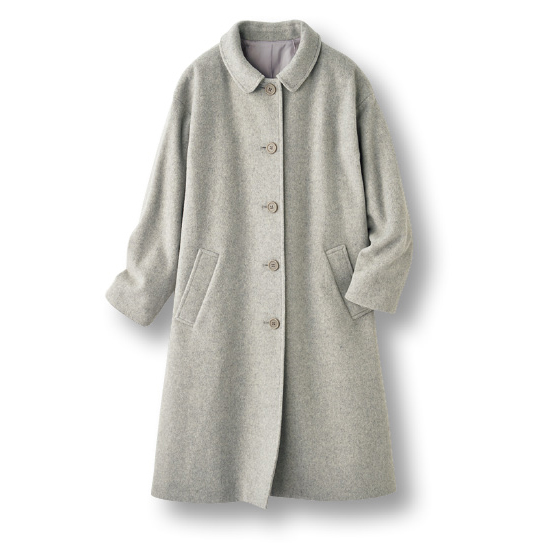 毛織物の産地、尾州の生地を使用。ウール糸に撚りをかけてふくらみ感をもたせ、ビーバー加工で起毛感を加えた、やわらかな肌触りと暖かみのある素材です。丸みのある衿や緩やかなAラインで、ほんのりかわいらしさもプラス。カジュアルにも着られるステンカラーコートです。
