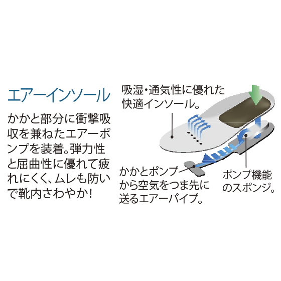 かかと部分に衝撃吸収を兼ねたエアーポンプを装着。弾力性と屈曲性に優れて疲れにくく、ムレも防いで靴内さわやか!