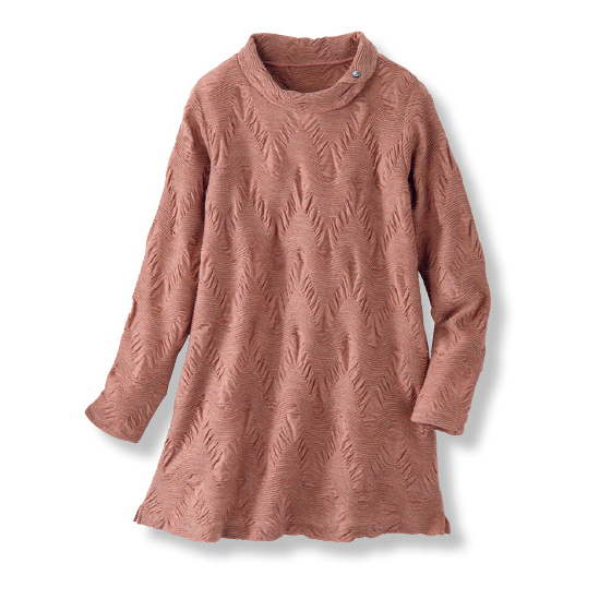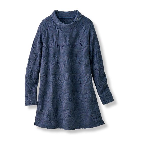 ふっくらジャカードの表面感が華やか。1枚で美しく着映える。ヒップまで隠れる丈感で腰回りもカバー。
