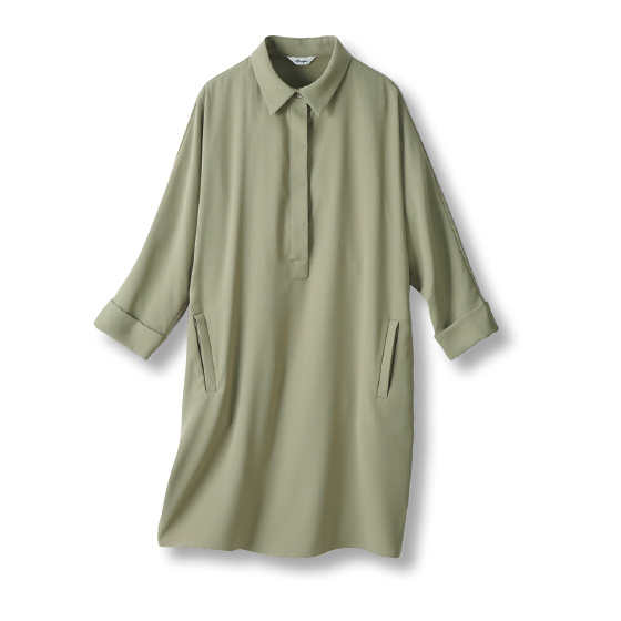 シボ表情のあるジョーゼット生地は、ソフトに落ちて体形カバー。袖下たっぷりで胸回りがラクなのに、裾が広がらないシルエットですっきり見えます。