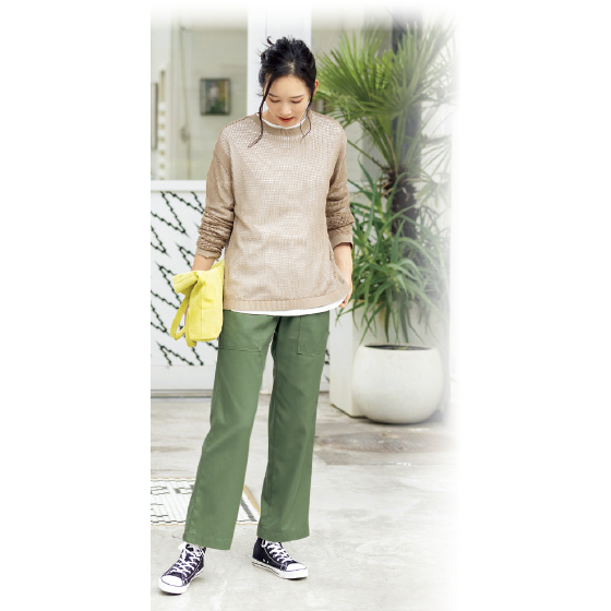 しっとり落ち感のある生地で、カジュアルなベイカーパンツが大人向きにこなれたきれい派。ゆるめのストレートが脚線をカバーしながら、落ちてすっきり細見せ。※着用シーズンは春夏秋です。