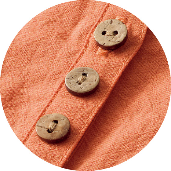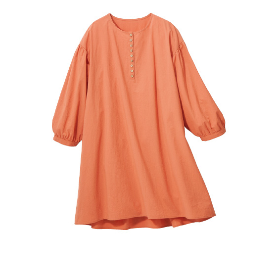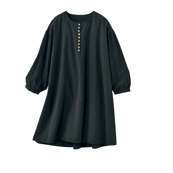透けすぎないコットン生地を、背中や袖口、少し落ちる肩山にもギャザーを使ってふんわりと。胸元に並ぶ木彫ボタンもナチュラルなチュニックです。後ろ下がりのゆったりシルエットで、気になる腰回りもカバー。