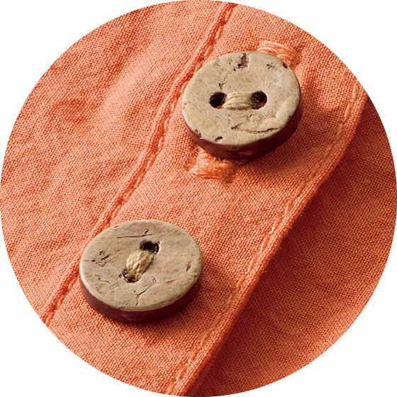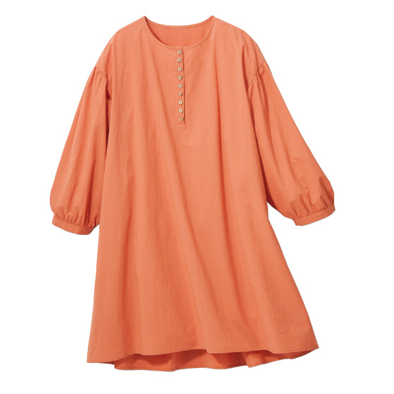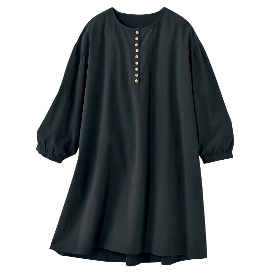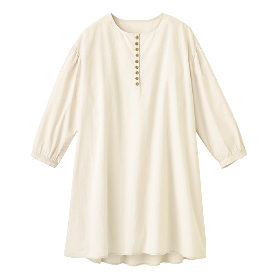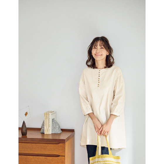 透けすぎないコットン生地を、背中や袖口、少し落ちる肩山にもギャザーを使ってふんわりと。胸元に並ぶ木彫ボタンもナチュラルなチュニックです。後ろ下がりのゆったりシルエットで、気になる腰回りもカバー。