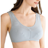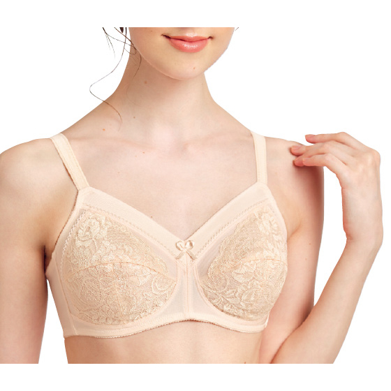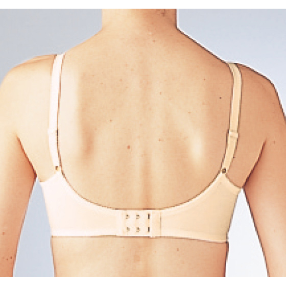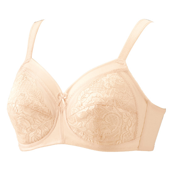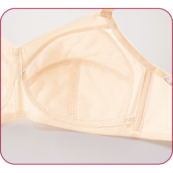 バストをソフトに包むストレッチ素材を使用。ズリ落ちにくいストラップで肩もラク。カップ裏は、肌にさわやかな綿混素材。段差ができにくい長めのサイドボーン。