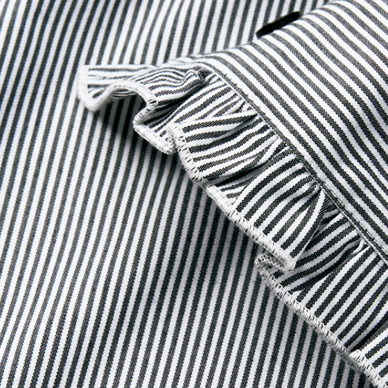 シワになりにくい機能糸を使い、お手入れを簡単にしたシャツチュニック。背中ギャザーでゆったり着られ、ボトムに1枚でお出かけコーデが完成です。肌寒いうちは、衿と袖口に効かせたフリルをニットの下からのぞかせて、映える重ね着が楽しめます。