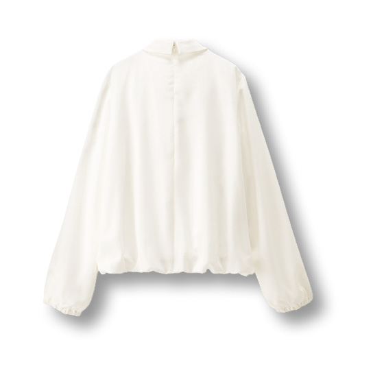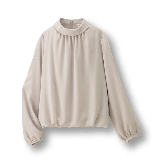 ロール衿やギャザー使いのクラシカルな胸元が上品で華やか。表地はしなやかなジョーゼット、裏地はストレッチ性のあるニットの起毛素材できれいに見せながら、暖かな着心地です。裾はゴムギャザーで、着るだけできれいなブラウジングシルエット。