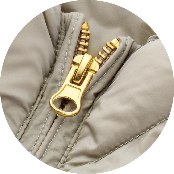 ゴールド色のファスナーがキラリと上品。ウエストを絞ってシルエットアレンジも自在。