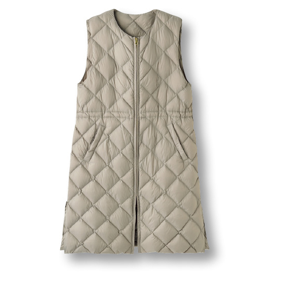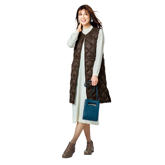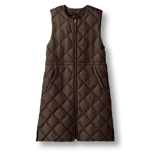 しなやかな軽量生地に、保温性のよいダウンを薄めに詰めたジレ。ダウンが均一に行き渡って暖かく、薄手で軽やかな着心地なので、着ぶくれしにくくすっきり見え。季節早めから着られて、寒さ本番にはコートインでライナー代わりに使えます。はっ水仕上げで雨の日にも。