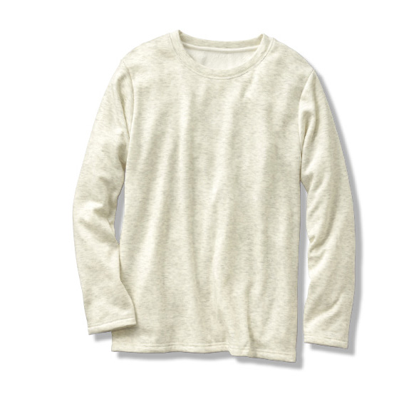高校生(寒がり)が気に入ってます。トレーナーみたいな襟首ですが素材的にはぶ厚いあったか肌着みたいな感じです。でもこんな裏起毛の毛足の長いトレーナーや肌着って見たことないし、すごく買ってよかった。コットン系の黒と違って「真っ黒」ゆえ洗濯による細かい糸くず付着が目立ちやすいので、ズボラの私は黒でも杢っぽい色とか希望します。(黒だけまとめて洗ったりしないので、、汗)