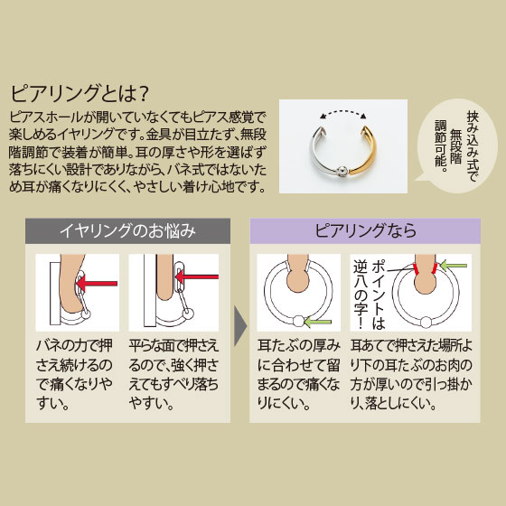 ピアスホールが開いていなくても着用できるピアリング。1万回の開閉試験をクリアした特殊構造で、イヤリングのような締め付け感が少なく、長時間の着用でも痛くなりにくいのがうれしい。前後を替えて使えるリバーシブルタイプです。