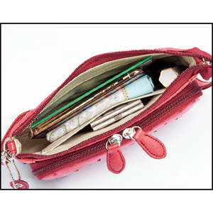 ●仕様:開閉=天ファスナー式、ポケット=外部にオープン式1個・ファスナー式1個(内部にカードポケット7個・仕切り兼用ファスナー式小銭入れ1個)、内部にオープン式1個・ファスナー式1個付き