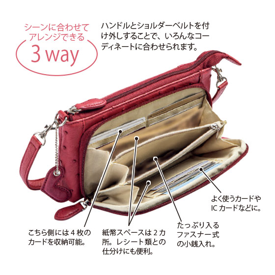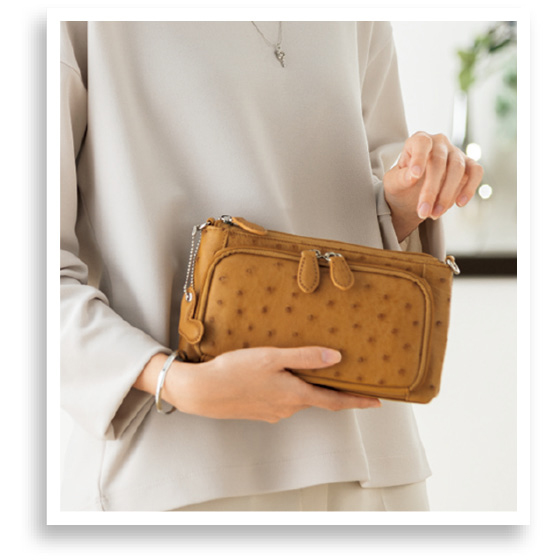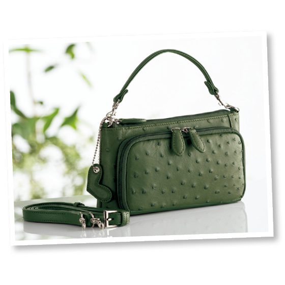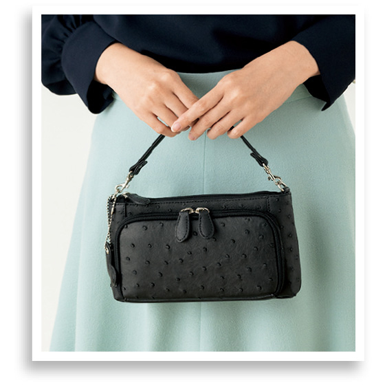 ●素材:表地=オーストリッチ革、底面/合成皮革、裏地=ポリエステル、ハンドル・ショルダーベルト=合成皮革