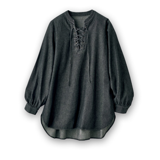 ふっくら袖と編み上げの胸元で、1枚着ればコーデが鮮度アップ。ゆったり体形カバーしながら、デニム仕立てでこなれ見え。