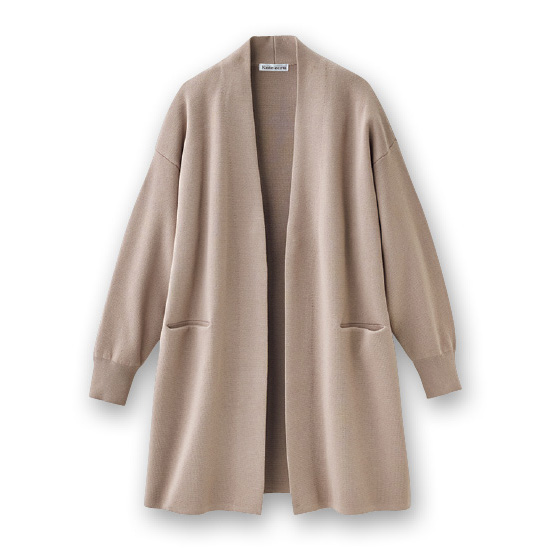 体の線を拾いにくい、マシュマロミラノリブ。首に沿う高い後ろ衿が暖かく、大人映えするロング丈。