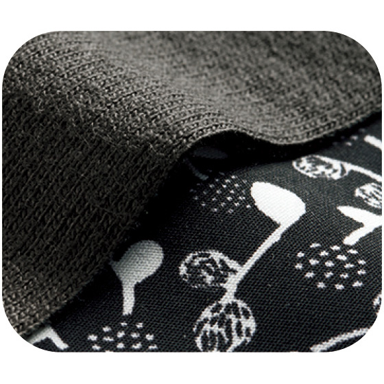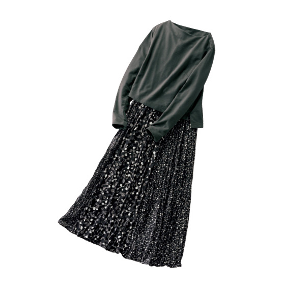 ミニ裏毛のトップスに、マットサテンのスカートをドッキング。軽やかな動きと、サイズの異なる3つの「ヴァアプッカ」柄生地の組み合わせがアクセントに。