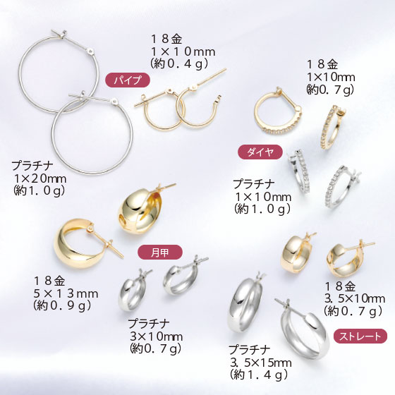 ●材質:パイプ・月甲・ストレート=プラチナ/プラチナ900、18金/18金、ダイヤ=ダイヤモンド20石(計0.1ct)、地金部/プラチナ=プラチナ900、18金=18金
