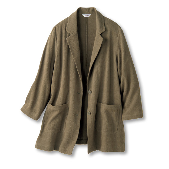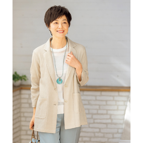 涼やかな楊柳柄をドビー織りで表現した綿100%生地。きちんと感のあるテーラード衿。うれしいポケット付き。