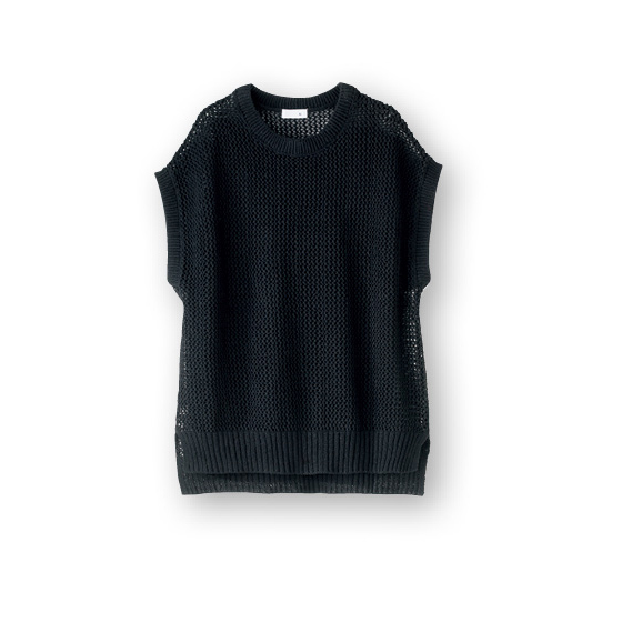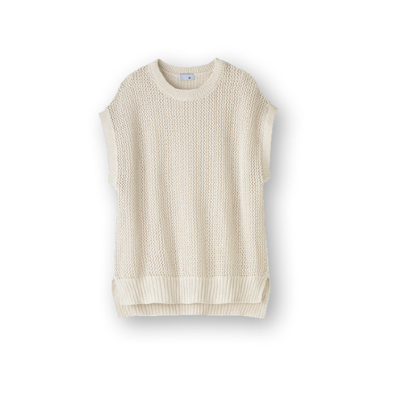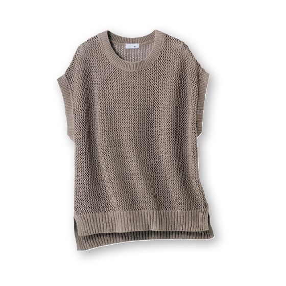 フレンチリネンとコットンをブレンドし、さらりとやさしい着心地に。ざっくり編みの透かし柄なので、Tシャツやブラウスに重ねても涼しげです。
