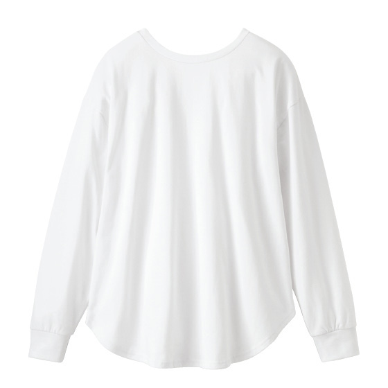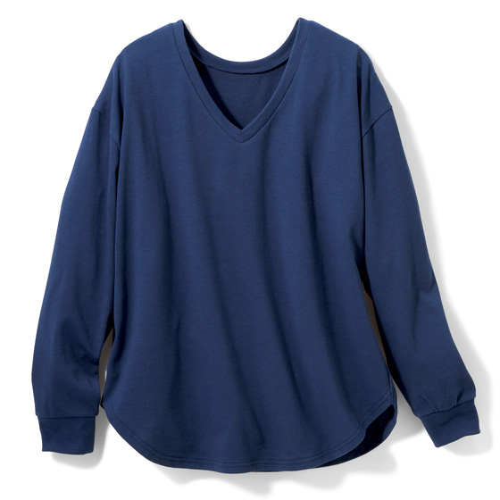 深めのV開きとクルーネック、どちらを前にしても着られる2WAYデザイン。袖口はリブなので、たくし上げて着こなしてもOK。ラウンド裾だからトップスアウトも簡単に決まります。