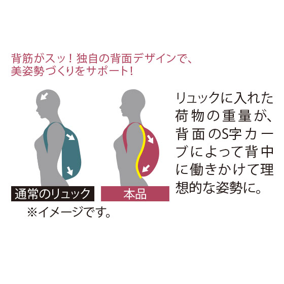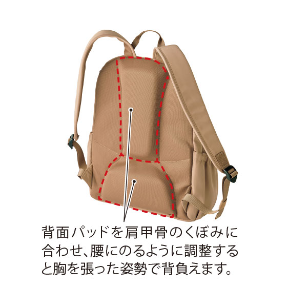 リュックに入れた荷物の重量が、背面のS字カーブによって背中に働きかけて理想的な姿勢に。背面パッドを肩甲骨のくぼみに合わせ、腰にのるように調整すると胸を張った姿勢で背負えます。