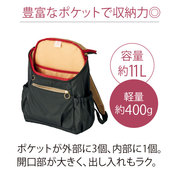 ●素材:ポリエステル・合成皮革、裏地=ポリエステル、リュックベルト=ポリエステル