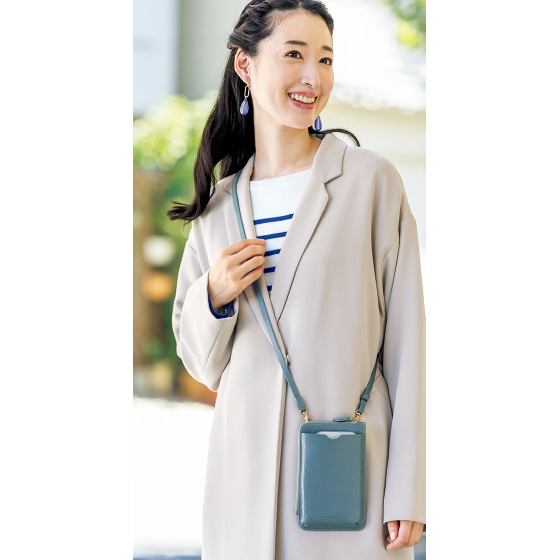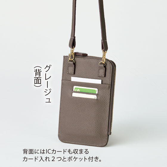 コーデを選ばない、上品でシンプルなデザイン。背面にはICカードも収まるカード入れ2つとポケット付き。