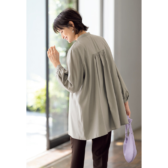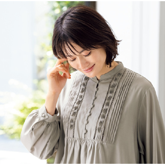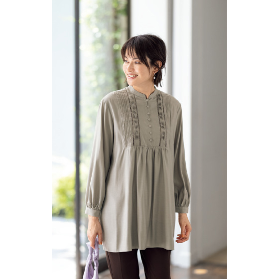まだ肌寒い時季でも暖かく着られる春らしいブラウスを。そんな思いからつくられたシャツです。上品な光沢の生地を使い、フロントにピンタックやはしごレースなど華やかなディテールをあしらいました。身頃裏には肌当たりよく暖かなカットソー生地を施し、1枚でも主役級の装いに。体のラインを拾いにくいチュニック丈もうれしいポイントです。