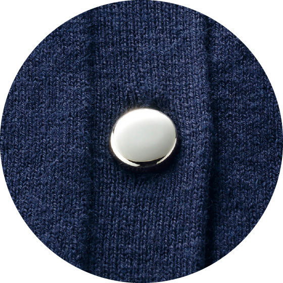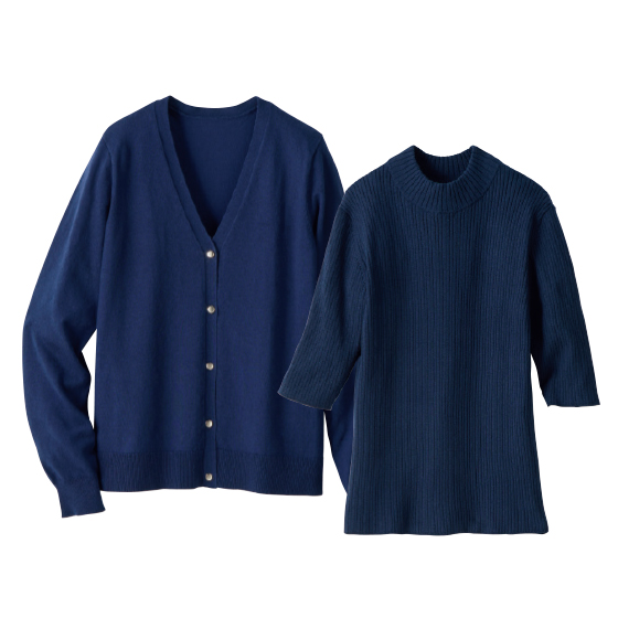 シルクのネップ(糸の節)感がナチュラルな編み地は、繊細なハイゲージでなめらかな肌触り。天竺カーデは華やぐ金色ボタン、リブプルオーバーは首元をカバーするプチハイネック。単品でも着回しやすいセットです。