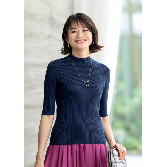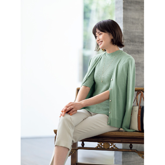 ●素材:綿43%・レーヨン37%・ナイロン17%・シルク3%(ニット、カーディガン=天竺、プルオーバー=リブ)