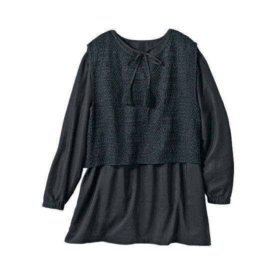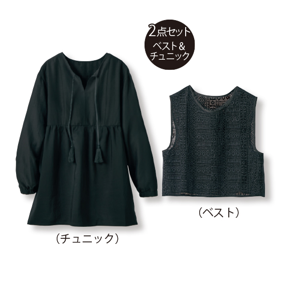 ●素材:チュニック=ポリエステル100%(織物、平織)、ベスト=ナイロン55%・綿45%(ニット、レース編み)