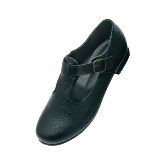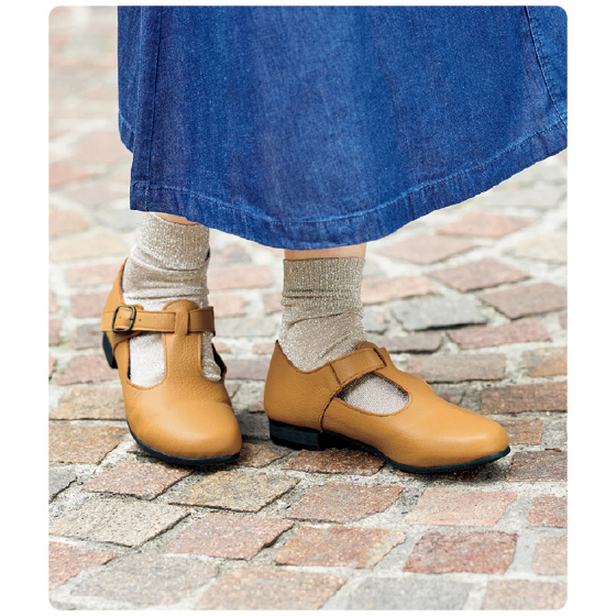 日本製の牛革が驚くほどソフト。足が痛くなりにくい革を、ホールド感のあるTストラップに仕立てました。コロンと丸いフォルムで、ソックスやタイツ合わせも楽しいデザインです。