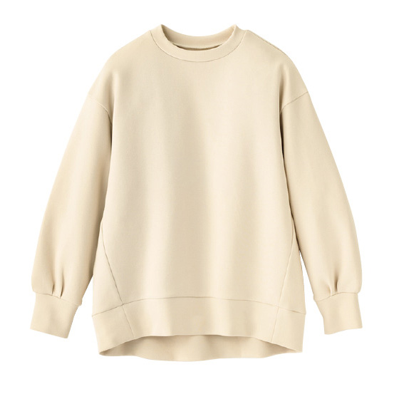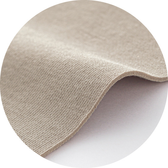 表地と裏地の間を中糸が立つように編み込むことで、2層の間に空気をため込み暖か。もっちりソフトな風合いで、体の線を拾いにくいハリ感もある素材です。