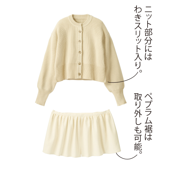 シャツにカーディガンを重ね着したようなドッキングデザイン。裾のペプラム部分を取り外せばカーディガンとしても着用できます。
