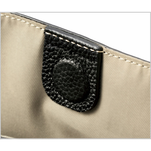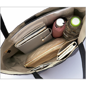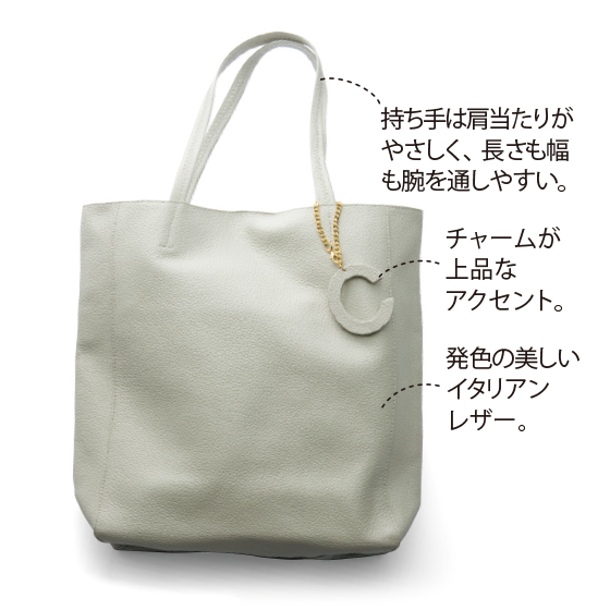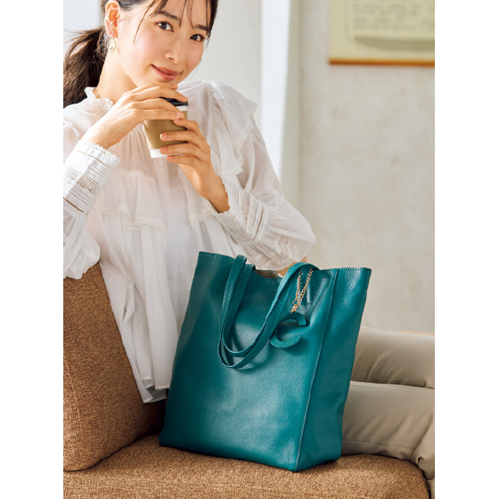 持ち手は肩当たりがやさしく、長さも幅も腕を通しやすい。A4サイズが収納できる使い勝手のよさ。内側ポケットも便利です。