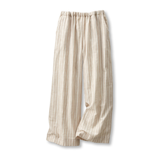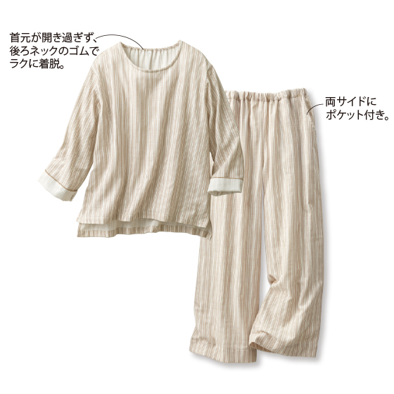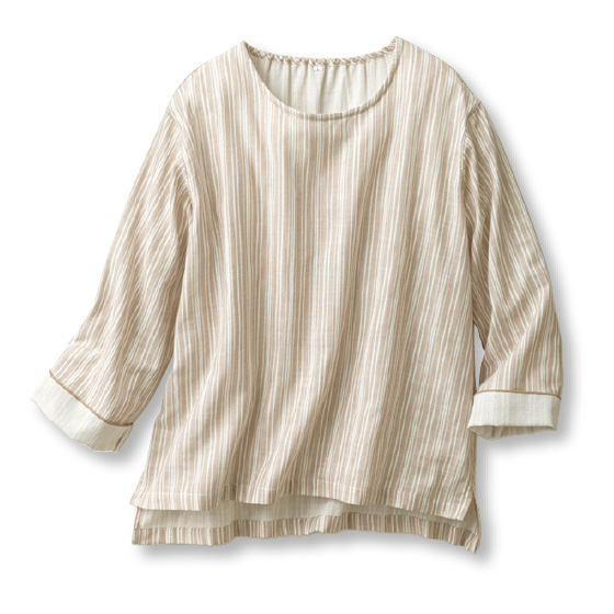 シンプルな衿なし7分袖で、残暑から秋、春を迎えてからも長く着られます。部屋着にも素敵なすっきりストライプ柄。